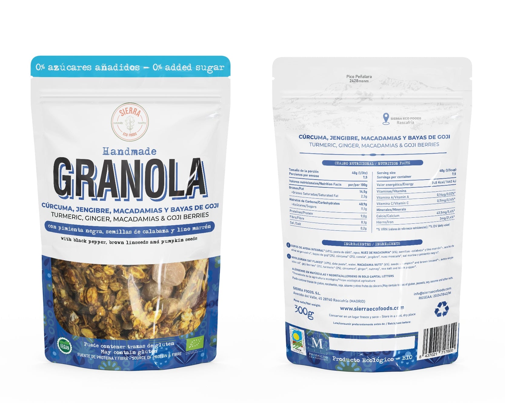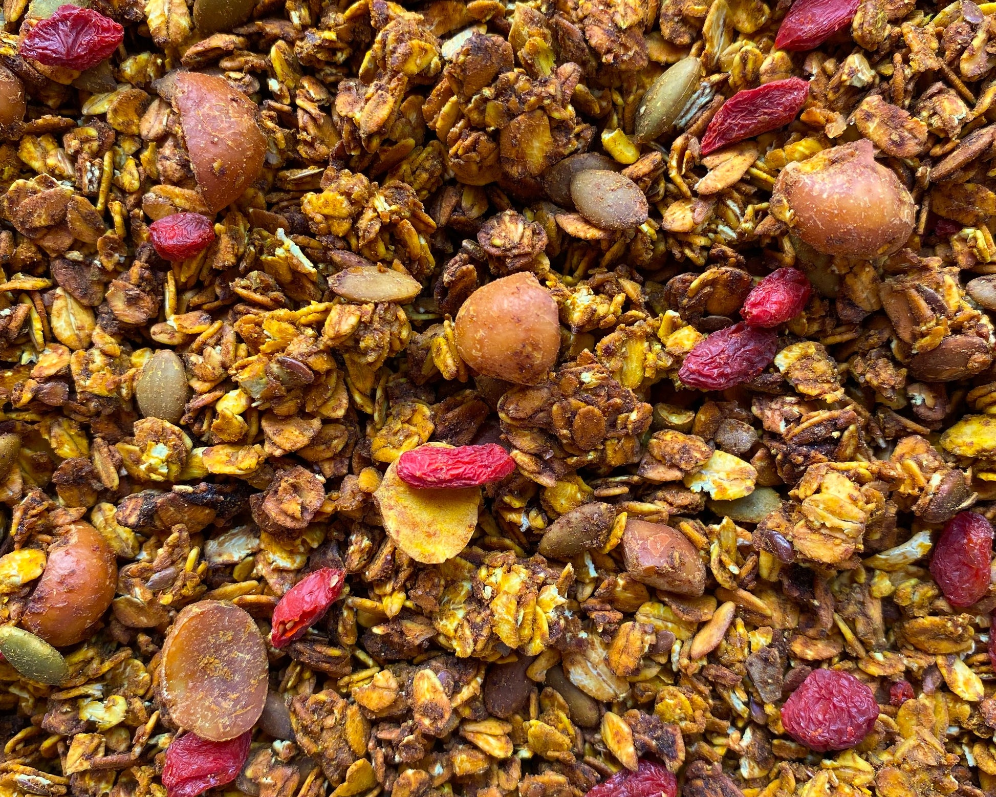 GRANOLA DE CÚRCUMA, JENGIBRE, MACADAMIAS Y BAYAS DE GOJI