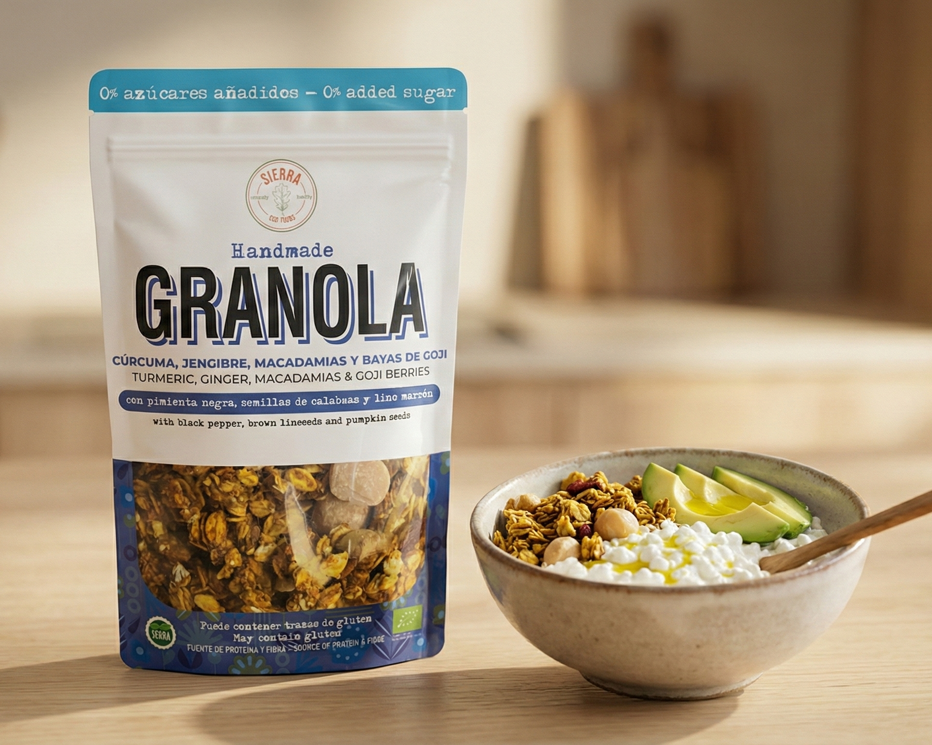 Sí. Nuestra granola está hecha con ingredientes ecológicos reales: cereales integrales, semillas, frutos secos y un toque de dulzor natural. No usamos ultraprocesados, conservantes ni rellenos vacíos. Es energía limpia para empezar bien el día.